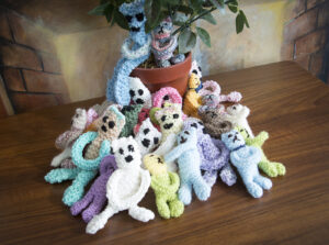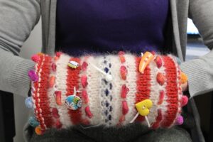 These brightly coloured items consist of a simple knitted tube which can be worn over the hands, but which are also adorned with bows, buttons, beads, bells, and other ornate items which the wearer can ‘twiddle’. More recently, the Trust has received similar donations of fidget bears and blankets too.
