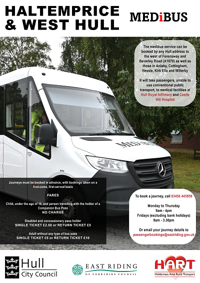 Operated by North Holderness Community Transport (HART), journeys on the Medibus must be booked in advance, with bookings taken on a first come, first served basis.