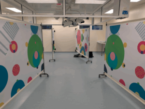 There are two operating theatres which can run concurrently, and recovery space for up to 16 children. Inside each theatre, teams make use of ‘kwickscreens’, highly decorated screens designed to minimise stress by preventing children from seeing medical equipment and surgical instruments while they are being anaesthetised.