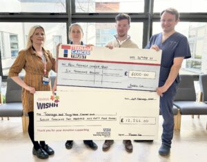 Freddie presents cheques to (L-R) Charlene Kent, Vic Walsh and Dr James Bailey from The Queen’s Centre, Castle Hill Hospital