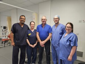 (Left to right): Stephen Kalladayil, Junior Charge Nurse, Luanda Branney, Charge ODP, Lyndon Land, Jack Stancer, Senior Perioperative Support Worker and Hannah Wright, Perioperative Practitioner.