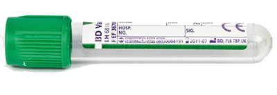 - 5 ml blood in dark green Lithium Heparin blood collection bottle.