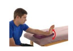 Sit up straight in a chair with your elbow tucked in by your side with your elbow bent. Turn your palm up towards the ceiling as much as you can without moving the upper arm away from your body. Feel the stretch and hold for 10 seconds. Repeat turning your hand palm down.