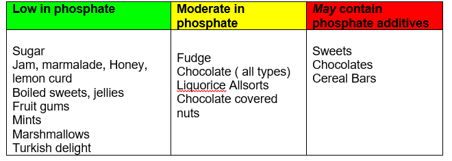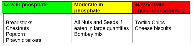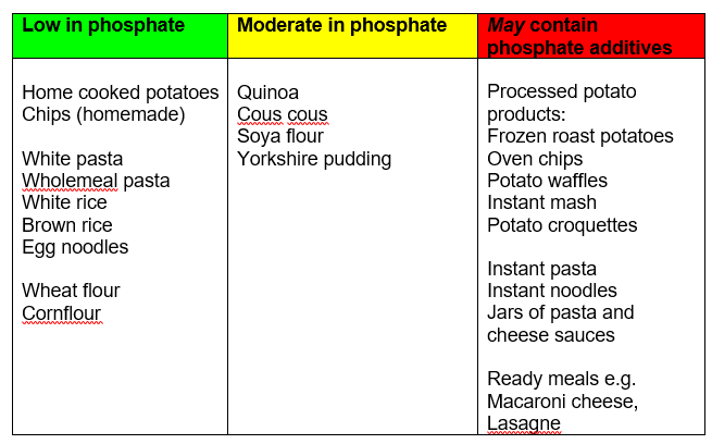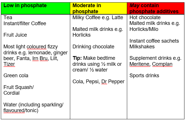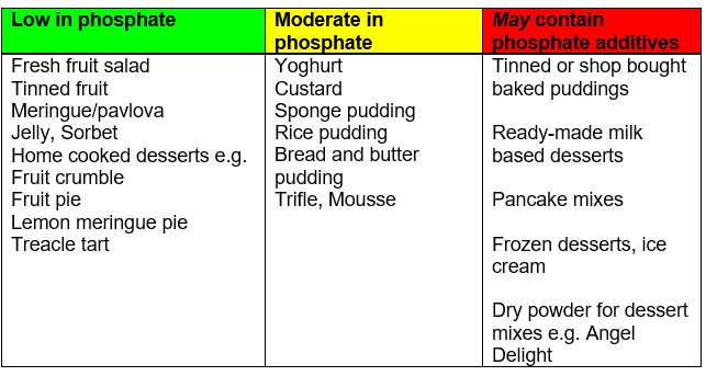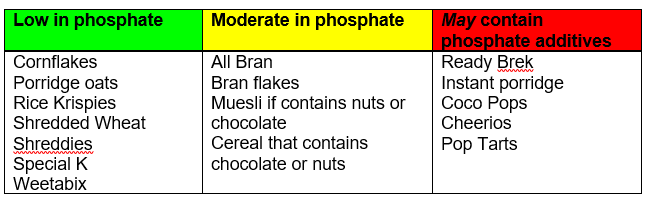 The following list foods that are high in phosphate and gives lower phosphate alternatives. We have also indicated which of these foods may contain phosphate additives but this can vary according to manufacturer which is why it is important to check the ingredients list. If there are any foods or drinks that are not included you can ask your dietitian for advice.