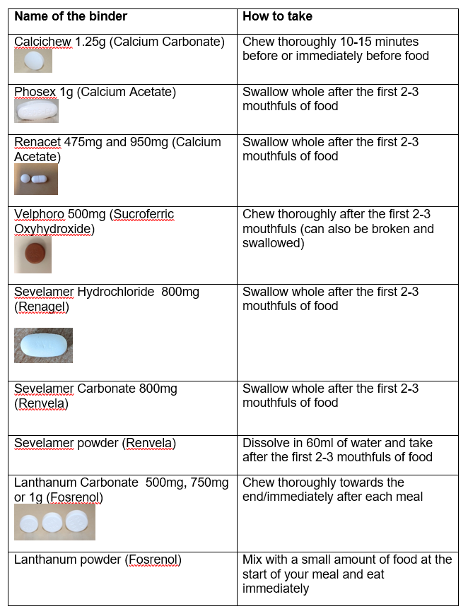 In addition to a low phosphate diet you may be prescribed some medication called phosphate binders. Binders combine with some of the phosphate in your food when it is being digested in your stomach, allowing it to pass out of your body with your stool (poo).