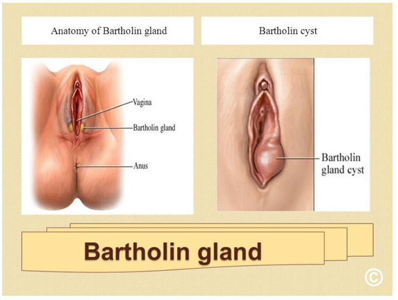 The Bartholin’s glands secrete fluid that acts as a lubricant during sexual intercourse. The fluid travels down tiny ducts (tubes) that are about 2 cm (centimeters) (0.8 inches) long into the vagina. If the ducts become blocked, they will fill with fluid and expand. This then becomes a cyst.
