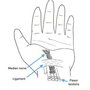 Carpal tunnel syndrome is a condition caused by one of the main nerves to the hand (the median nerve) being compressed (squashed) as it runs into the hand from the arm. This is sometimes due to thickening of a ligament running between the wrist carpal bones. The median nerve runs beneath this ligament along with the tendons to your thumb and fingers. Compression of this nerve may result in symptoms including; numbness and tingling (paraesthesia) in some of the fingers and aching pains felt in the hand and forearm. Symptoms are often worse at night but frequently affect people when they are driving, on the telephone or using their hands.