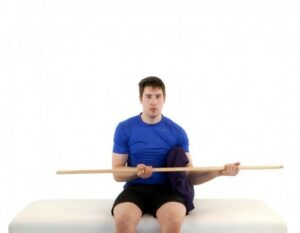 Keep your elbow tucked into your side and use your unaffected arm to push your affected arm out to the side.