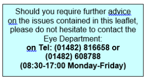Please contact the Eye Clinic if you need any further advice on tel: 01482 816658 or tel: 01482 608788 (8.30 am to 5.00 pm, Monday to Friday) or Out-of-Hours tel: 01482 604346 (Please listen to full voice message on how to access emergency out of hours service).