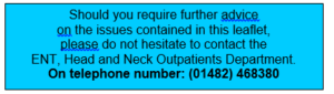 This leaflet was produced by the ENT, Head and Neck Outpatients Department, Hull University Teaching Hospitals NHS Trust and will be reviewed in April 2026.
