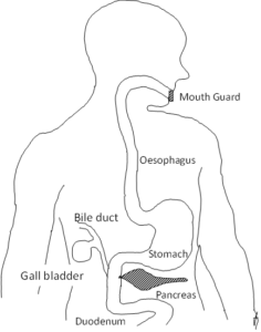 This diagram shows the route taken by the Endoscopic Ultrasound (EUS) instrument from the mouth, down the oesophagus, into the stomach and then into the duodenum where it is able to inspect for abnormalities in the pancreas, the bile duct, lymph glands and many other areas.
