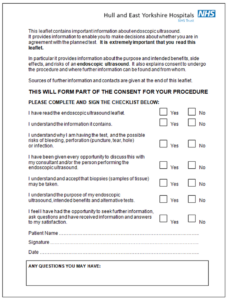 Please don’t simply not turn up for your EUS appointment. Discuss your decision with your consultant or their team first. If you still don’t wish to have the procedure then please let us know in good time (direct line tel: 01482 622069), so that we can reallocate the appointment to another patient on the waiting list, who may have a serious condition; help to save valuable NHS resources.