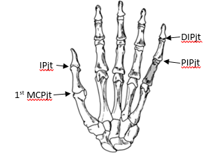 The finger and thumb interphalangeal (IP) joints are the small joints of the fingers and thumb. They are the joints between the finger bones. There are two interphalangeal (IP) joints in each finger, the proximal interphalangeal joint (PIPjt) and the distal interphalangeal joint (DIPjt). There is one interphalangeal joint in the thumb (IPjt). The thumb metacarpal joint (1st MCPjt) is the joint between the thumb bone and the hand bone.