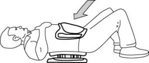 Hollow your stomach and contract the abdominals to roll the tail bone off the floor. Do not push down excessively through your feet. Sustain the contraction using minimal effort for approximately 5 secs.