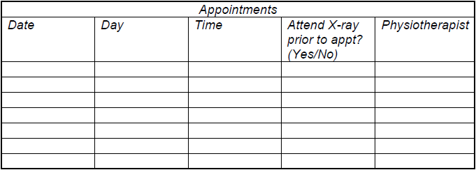 You may be expected to attend for follow-up X-rays to monitor the healing process. If this is the case then you will be provided with dates and times for these appointments by your physiotherapist. Please attend X-ray first and then to see the physiotherapist. Please allow good time for these appointments as occasionally there can be delays.
