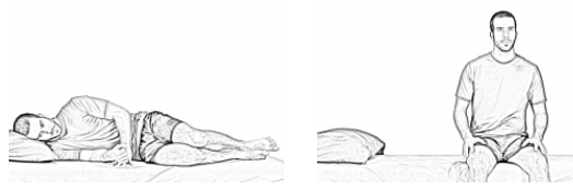 Roll onto your side and swing your legs over the edge of the bed, whilst pushing up with your arms (see following diagram). Please note the following: