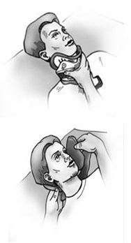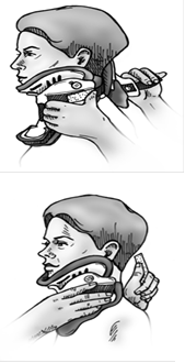 Keep your head and neck in a neutral position (nose in-line with belly button, chin level). Do not bend your neck forward, backward or side- ways. Be very careful not to move your neck while this is done. Remove the collar by undoing the Velcro straps. |