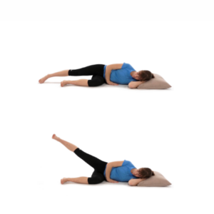 Lie on your side with your head supported. Bend lower leg. Lift the top leg up a small amount (about a third of the way up), keeping your leg in line with your body. Do not move the leg forwards. Do the exercises 5 to 10 times, repeat 1 to 2 times, do once or twice a day, hold each movement for 5 seconds.