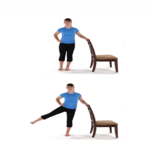 Stand upright and hold onto a chair. Move your leg out to the side without lifting your pelvis. Slowly return to the starting position. Do this exercise 5 to 10 times, repeat 1 to 2 times, do once or twice a day, hold each movement for 5 seconds.