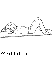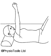 Lie on your back with arms by your sides. Clasp your hands together and lift your arms up as far as possible over your head towards the pillow.