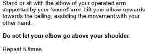 Stand or sit with the elbow of the arm, on the side which your surgery was performed, supported by your unaffected arm. Lift your elbow upwards towards the ceiling, assisting the movement with your other hand.