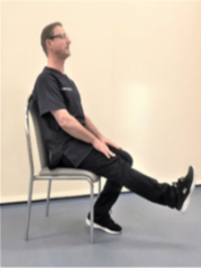 Leg extension – Sit in a sturdy chair, feet flat on the floor. Straighten one leg out in front of you until your leg is straight. Hold for a second, then slowly lower back to the floor. Repeat on the other leg.