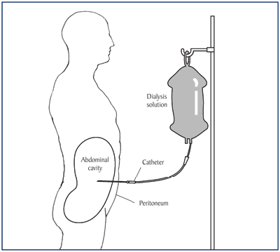 This dialysis works by filling the abdomen with dialysis fluid through a peritoneal dialysis (PD) catheter. Waste products and excess water are drawn into this fluid during dialysis. Several hours later, the fluid which now contains the waste products, is then drained out and replaced with fresh fluid. This process can also be carried out overnight using a machine called an automated peritoneal dialysis machine.