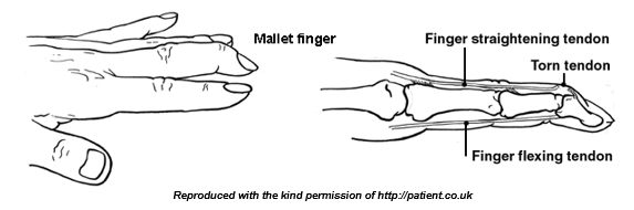 Sometimes a mallet finger is caused by a small piece of bone, where the tendon attaches, coming away from the bone with the tendon. This is known as a bony mallet injury. The effect of this will be the same, as the tendon is unable to straighten the end of the finger.
