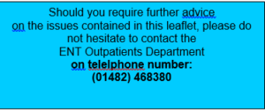 This leaflet was produced by the Ear Nose and Throat Department, Hull University Teaching Hospitals NHS Trust and will be reviewed in April 2026.