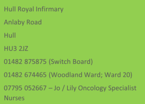 During your stay on the ward Dr Ashwini Kotwal (Consultant with Special Interest in Oncology) and Jo Lyons or Lily Bone (Children’s Oncology Nurse Specialist’s for Hull) will visit you if possible and make sure your stay is as pleasant as it can be. They will also make sure Leeds Guidelines are followed provide any additional support during your stay.
