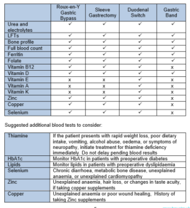 Table adapted from British Obesity & Metabolic Surgical Society GP Guidance: Management of nutrition following bariatric surgery 2014