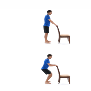 Stand holding a worktop or counter. Keep your back straight and your heels on the floor. Bend your knees slightly into a small squat, keeping your hips above knee level. Do this exercise 5 to 10 times, repeat 1 to 2 times, do once or twice a day, hold each movement for 5 seconds.