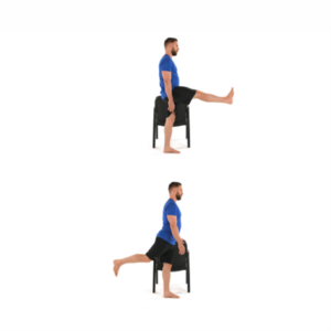 Stand on one leg and hold onto a stable surface. Swing the other leg forwa4ds and backwards, keeping the knee straight and your body steady. Do this exercise 5 to 10 times repeat 1 to 2 times, do once or twice a day, hold each movement for 5 seconds.