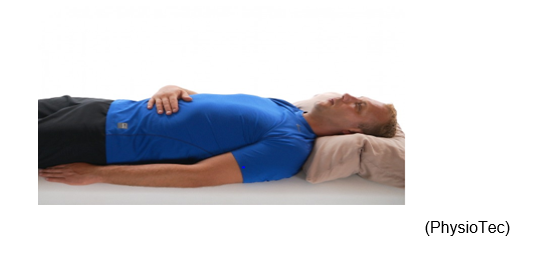 Lying on your back, head on a pillow and one hand on your stomach. Breathe in, for a count of 4 seconds, to inflate your abdomen under your hand, then breathe out. Using this exercise often helps decrease muscle tension and relieves pain.