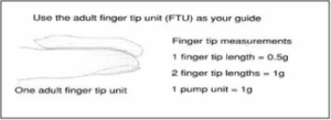 Use the ‘fingertip unit measurement’, see Figure 3. Topical steroids that are cream based will soak into the skin quickly whereas ointments will take longer.